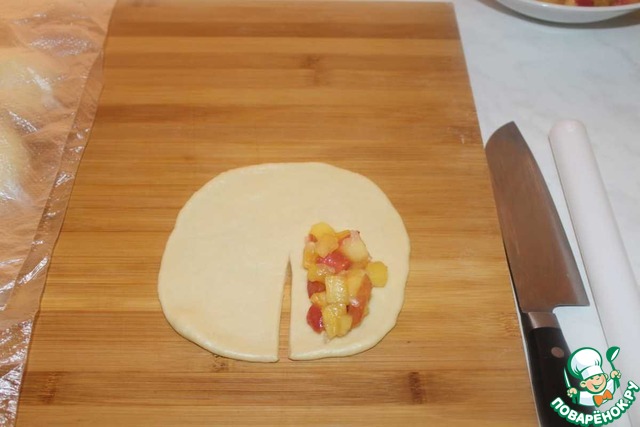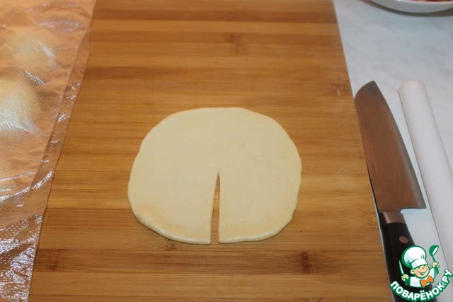 Раскатываем кусочек теста в круг толщиной 3-4 мм и делаем надрез.