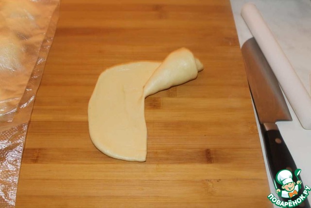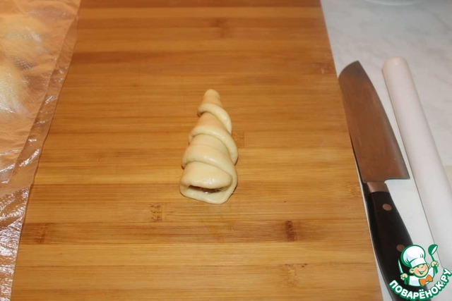 Скручиваем в трубочку. Завернув начинку, оставшееся тесто закручиваем вокруг рогалика, понемногу отступая от края вниз, оставшийся хвостик прячим под нижней узкой частью.