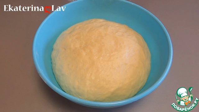 Тесто перекладываю в миску, накрываю пищевой пленкой и полотенцем. Оставляю для подъема на 1.5 часа.
