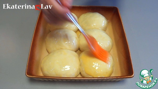 Через 40 мин. включаю духовку разогреваться до 200 °C, а пампушки смазываю оставленной половиной яйца.