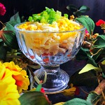 Салат выглядит привлекательно. Желток и белок добавляют салату ярких красок, помидоры освежают вкус, и в комбинации с мясом и сыром получается достаточно сытная закуска.