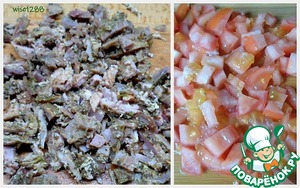 Пластик свинины обвалять в специях и обжарить на растительном масле до готовности. Охладить и порезать на кусочки. Помидоры порезать произвольно. Оставить небольшую часть помидора для оформления.