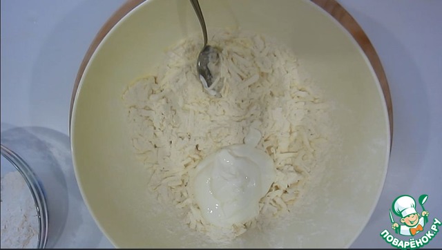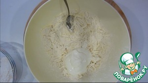 Смешиваем муку, соль, соду, сметану и натертое на терке масло.