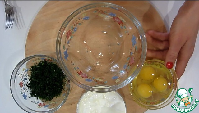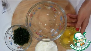 Сметану, яйца, соль и зелень хорошо смешиваем. Добавляем перец и приправу по вкусу. -