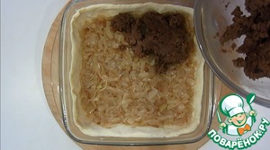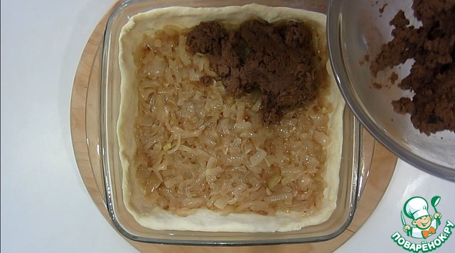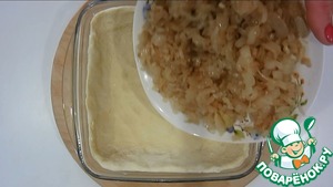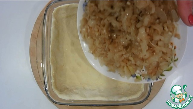 Выкладываем тесто в форму, затем лук.