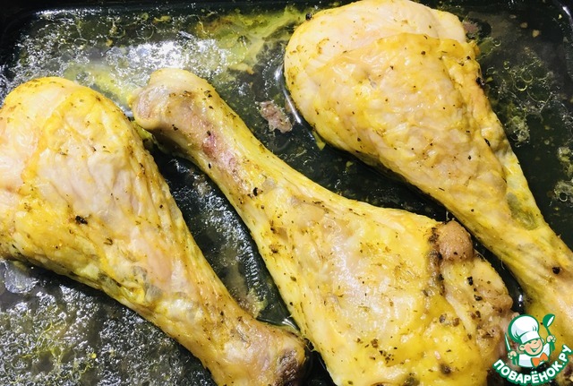 В оливковое масло добавить соль, чёрный перец, хмели -синели, чеснок все хорошо перемешать, хорошо смазать-натереть ножки, оставить на 2 часа. Выложить в форму, налить немного воды. Этого шага нет, фото потерялось. Поставить в духовку на 30-35 минут, 180", я на десять минут накрывала фольгой, потом сняла фольгу. Следите за своей техникой.