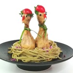 Выложить макароны на тарелку, майонезом сделать глазки, вставить перец горошек, носик из пюре тыквы. Я делала зубочисткой.