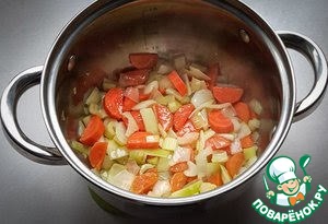Потомить лук, морковь, сельдерей минуты 3-4 -