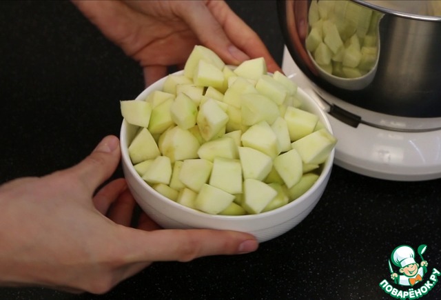 Пока яйца взбиваются, яблоки мою, очищаю, нарезаю достаточно крупно.