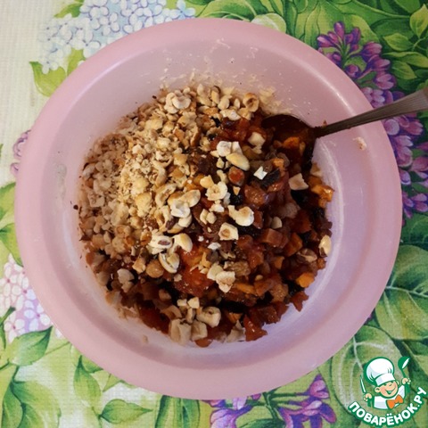 В тесто добавить все сухофрукты и орехи, у меня был фундук (я его немного измельчила).