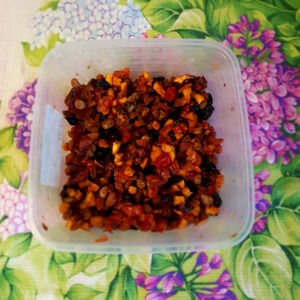 Я использовала следующие сухофрукты:финики, изюм, курагу, персики и цукаты из томатов.