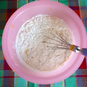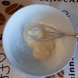 Просеять два вида муки (рисовую и пшеничную), добавить соду и разрыхлитель теста, замесить быстро тесто.