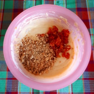 Добавить измельченные и предварительно обжаренные орехи, добавить цукаты.