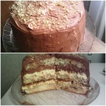 Очень пушистый, ароматный бисквит, с прослойкой крема чиз, карамели с добавлением орехов и шоколадного крема.
