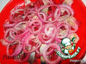 Кусочки сельди уложить в глубокую посуду, прослаивая смородиной и луком.