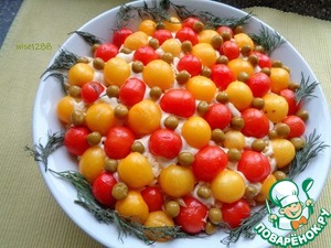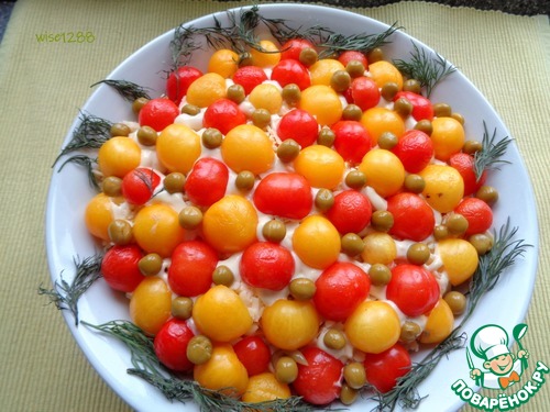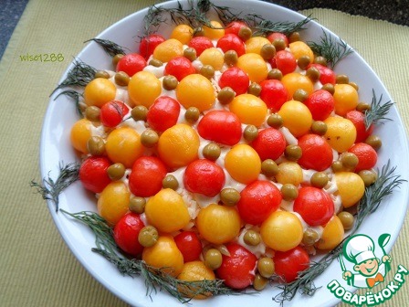 Помидоры черри разрезать на половинки и разложить по поверхности салата, чередуя красный и желтый цвет. Между помидорами разложить зеленый горошек и оформить зеленью укропа. Приятного аппетита!!!