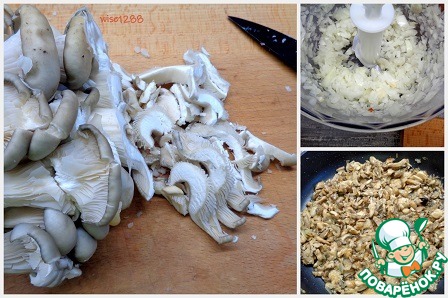 Вешенки порезать произвольно, лук измельчить. Пожарить лук, на столовой ложке растительном масле, пять минут, добавить вешенки и продолжить жарит еще восемь минут, посолить.