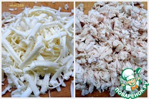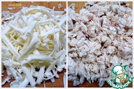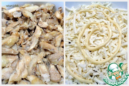 Третий слой - вешенки, пережаренная с луком, затем слой сыра. Нанести майонез.