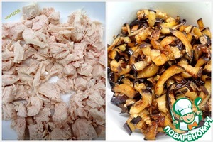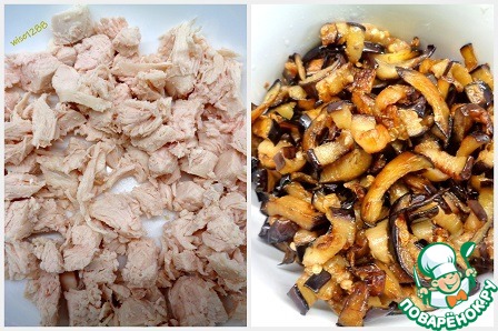 Собрать салат: первым слоем в салатник положить куриное филе, вторым слоем жаренные баклажаны.