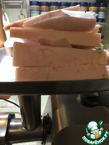Прокручиваем сало с чесноком через мясорубку. Чеснок вперед!!