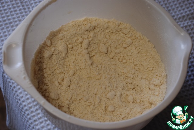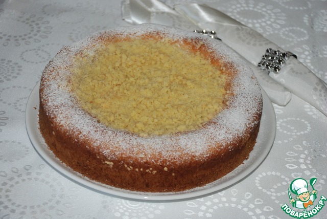 Для штрейзеля перетереть муку, сахар и масло, посыпать пирог.