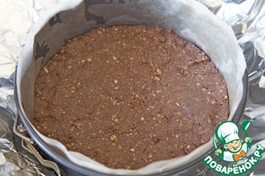 Смолоть печенье, смешать его с маслом. Выложить на дно застеленной пергаментом формы и утрамбовать. Подпечь 10 минут при 170*С или заморозить.