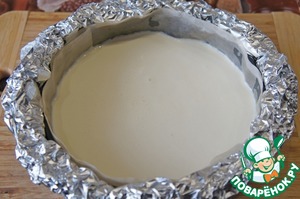 Вылить сырную массу на печенье. Поместить форму в больший по размеру противень, наполненный до середины кипятком. Выпекать при 150*С в течение приблизительно 45 минут на водяной бане. Серединка готового чизкейка должна немного колыхаться. При необходимости увеличить время приготовления. Вынуть из духовки, дать остыть.