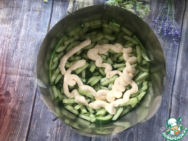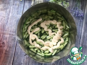 Первый слой - порезанные крупной соломкой огурцы, майонез.