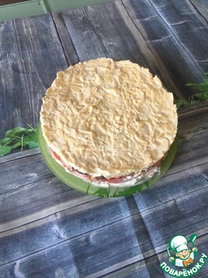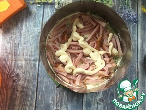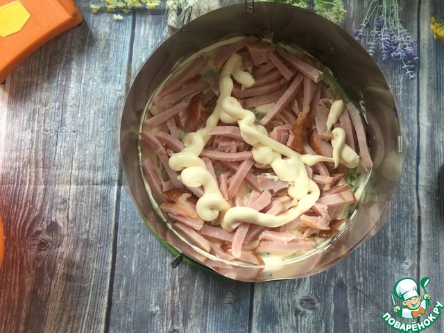 Второй слой - корейка свиная, майонез.
