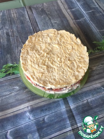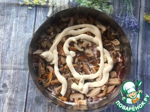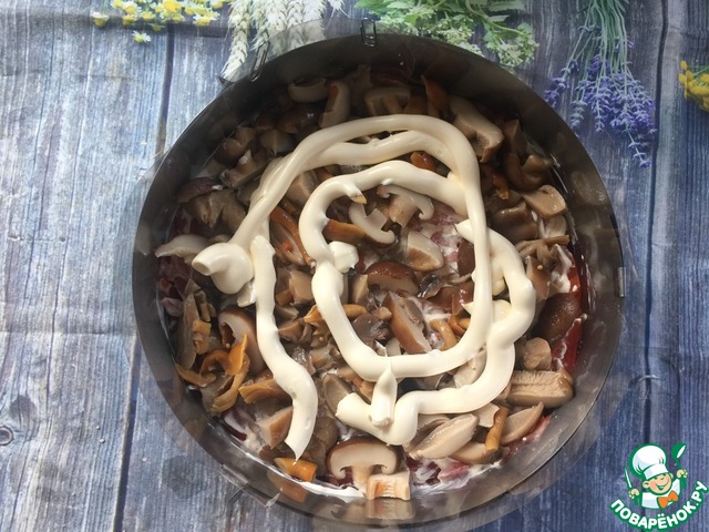 Третий слой - томаты крупной соломкой, майонез. Четвертый- порезанные маринованные грибы, майонез.