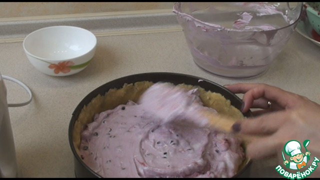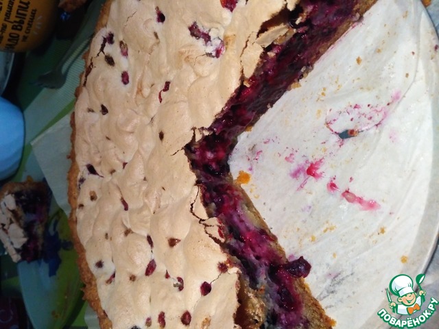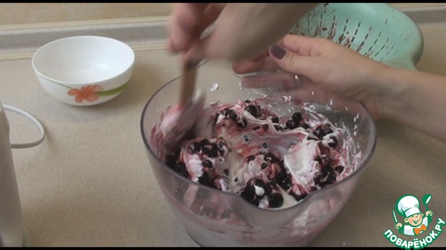 Смородина у меня замороженная, я её наполовину разморозила и добавила к белковой массе, аккуратно размешала, чтобы на полопались ягодки.