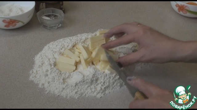 К муке добавить щепотку соли, холодное сливочное масло и порубить ножом. Потом растереть руками в крошку.