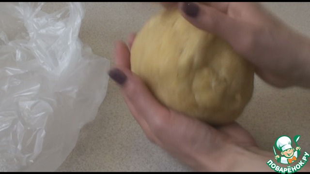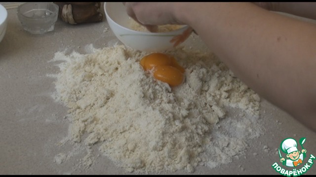 Добавляем сахар, разрыхлитель, желтки и замесим тесто. Долго месить не нужно, собрать тесто в комок и готово.