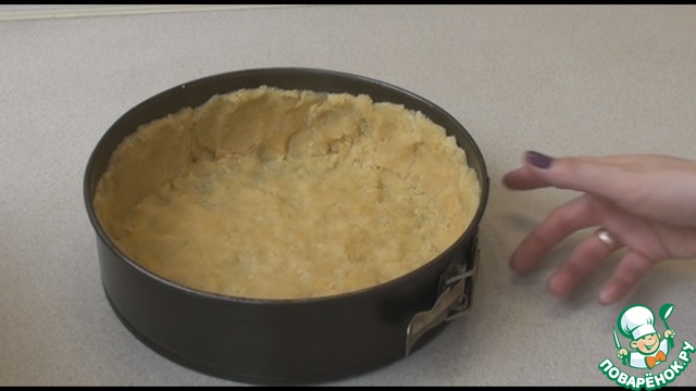 Форма у меня 24 см, смазываем её маслом. Достаём тесто и руками распределяем его по форме и по бокам, формируя бортики. Поставим в холодильник пока взобьем белки и приготовим начинку.