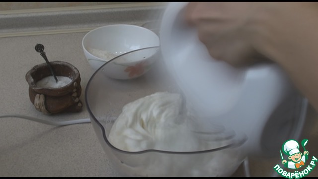 Берем охлажденные белки, добавляем щепотку соли и взбиваем до устойчивых пиков. Потом постепенно добавляем сахар, ванильный сахар, продолжая взбивать.