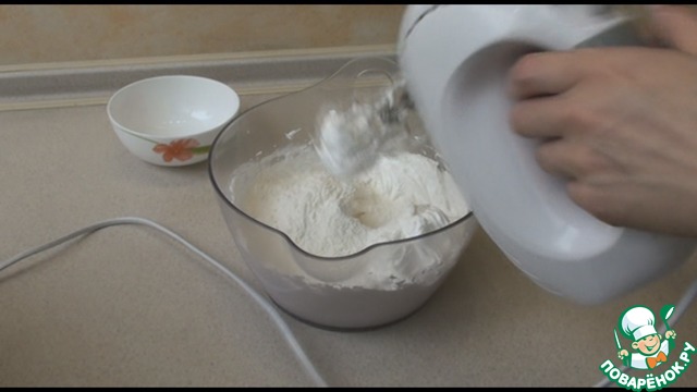 Смешаем муку с крахмалом и разрыхлителем, добавляем в взбитые белки, еще раз размешаем миксером.