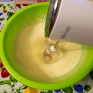 Муку просеять с разрыхлителем. Добавить муку к взбитой массе и замесить тесто.