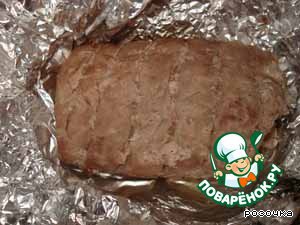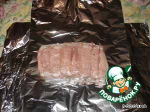 Выкладываем мясо на фольгу (я беру длинный кусок фольги и кладу его вдоль стола, потом отрываю еще один такой же кусок фольги и кладу его поперек- получается крест из фольги)