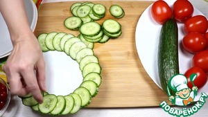 Огурец нарезаем кольцами. Распределяем на тарелке по кругу.