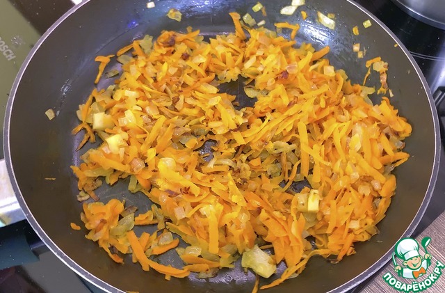Лук мелко режем, морковь трём на терке и обжариваем на растительном масле