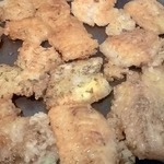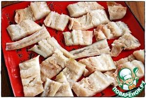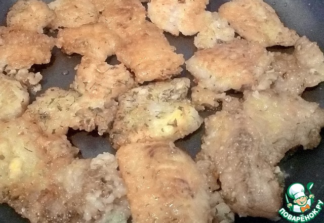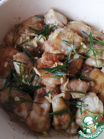 Нарезаем на порционные кусочки, не очень большие, но и не маленькие. Присыпаем кукурузным крахмалом, обваливаем, отставляем.