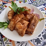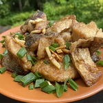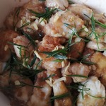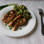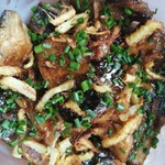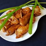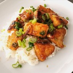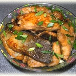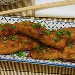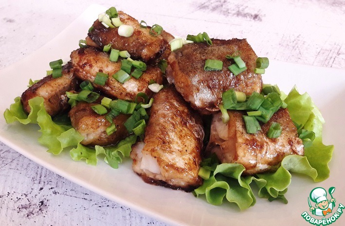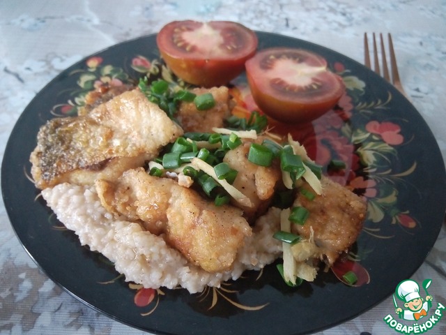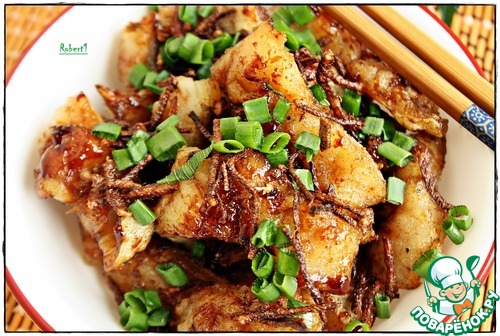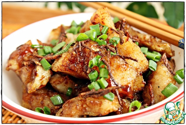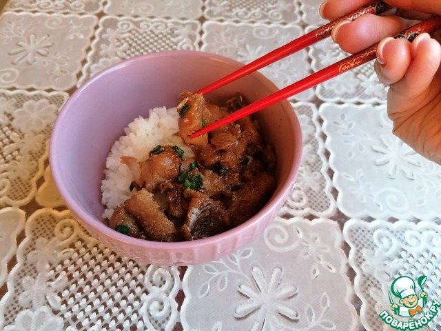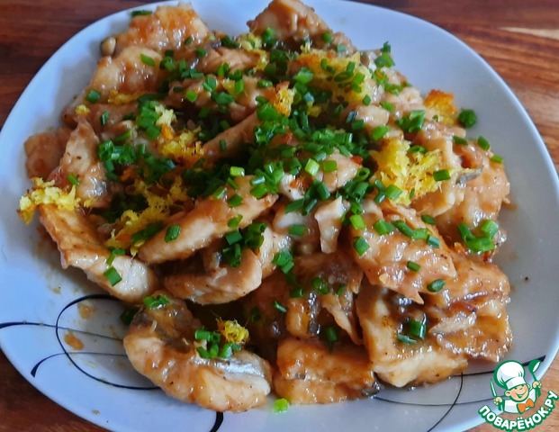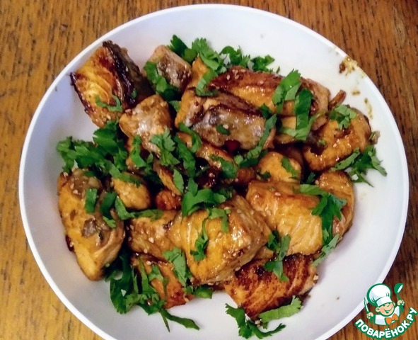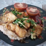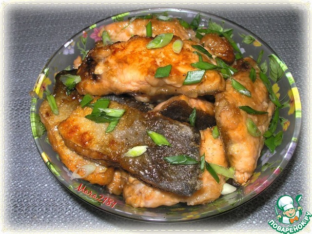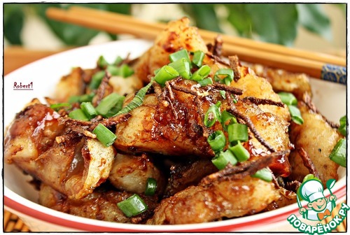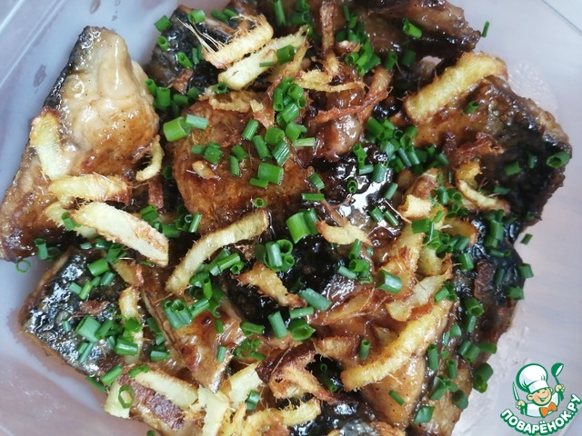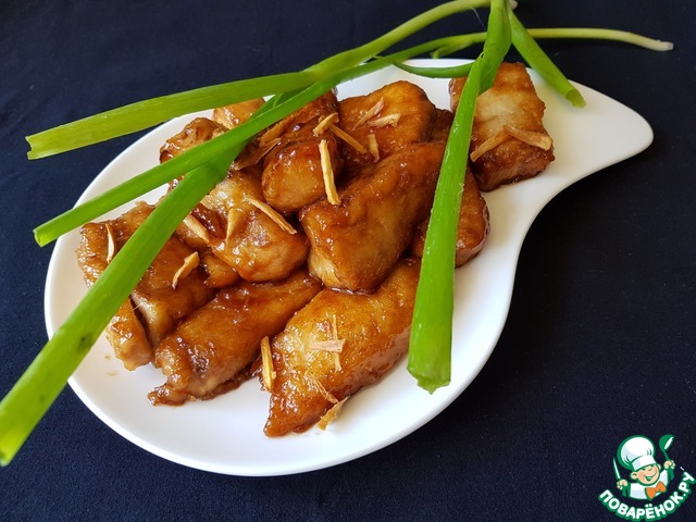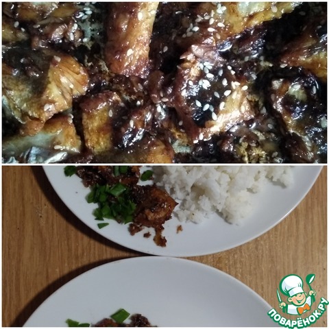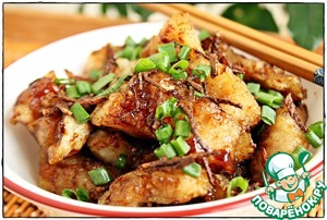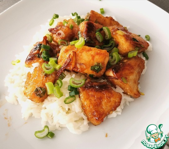 Когда Вы будете удовлетворены полученным результатом, перекладываете рыбу в тарелку, присыпаете жареным имбирём и зелёным луком. В начале рецепта я указал, что это количество расчитано на две порции так, как эта рыба подаётся на рисе, приготовленном на пару. Скажу честно - она прекрасно улетает и без риса, но тогда становится одной порцией...
