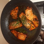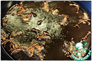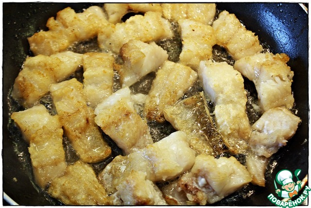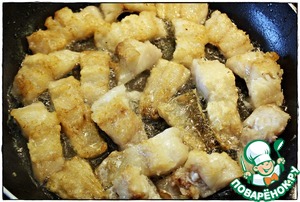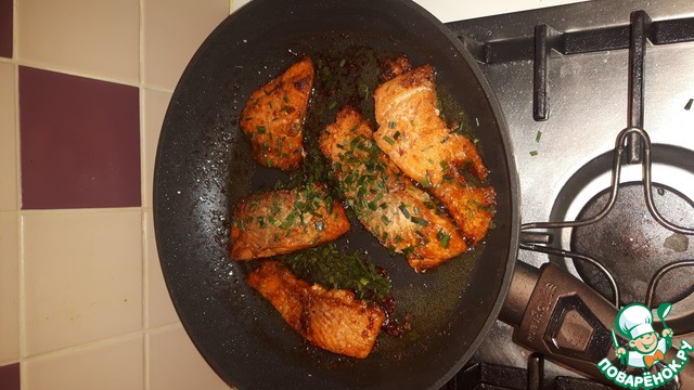 В это же масло выкладываем рыбу, жарим до золотистой корочки с обеих сторон осторожно переворачивая щипчиками, лопаткой, палочками. Когда рыба покроется красивым загаром, выливаем в сковороду соус и ждём когда он закипит. После этого уменьшаем огонь до минимума и продолжаем готовить до карамелизации, переворачивая туда-сюда...