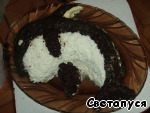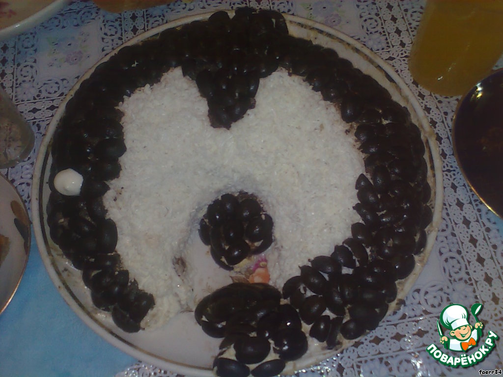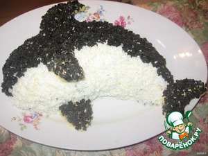 Салат выкладывается слоями. Я делала в форме кита (или дельфинчика, или акулы... ну, одним словом, выбирайте). Можно просто выложить слоями на блюдо. Каждый промазывается майонезом.