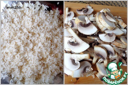 Рис отварить. Я варила в микроволновке на программе «каша» 22 минуты при мощности 1000 Вт. Шампиньоны порезать.