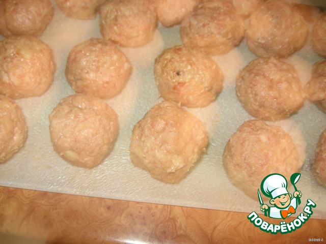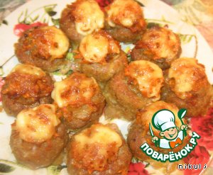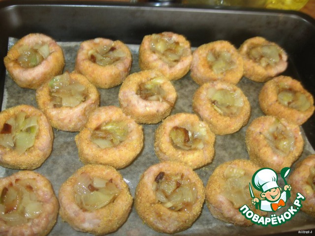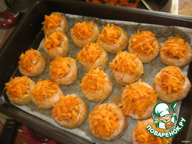 Из фарша делаем шарики, пальцем делаем в них углубление, формируем гнездо, кладем ложку лука, потом моркови и устанавливаем на противне, смазанном маслом. Сверху поливаем майонезом.