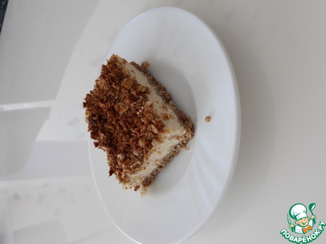 Выложить большую часть крошки в форму размером 23 х 16 см, застеленную пергаментом. Утрамбовать и сформировать бортики. Выложить творожную начинку. Оставшуюся крошку смешать с кокосовой стружкой или орехами. Присыпать заготовку сверху.