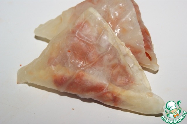Нарезать капустный лист на полоски и поместив на край фарш, сложить треугольником. -