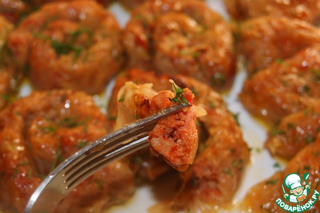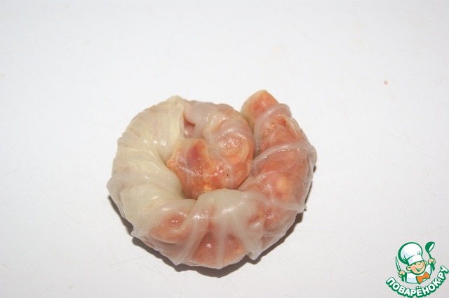 Из оставшейся капусты и фарша, я накрутила маленькие, на один укус голубцы, более традиционным способом.