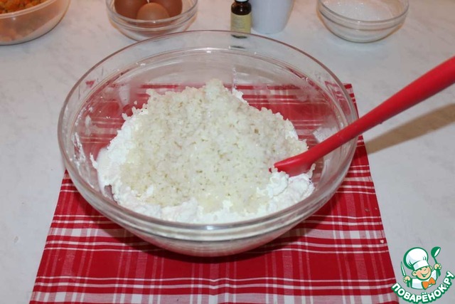 В творожную массу добавляем отваренный рис. Хорошо перемешиваем.